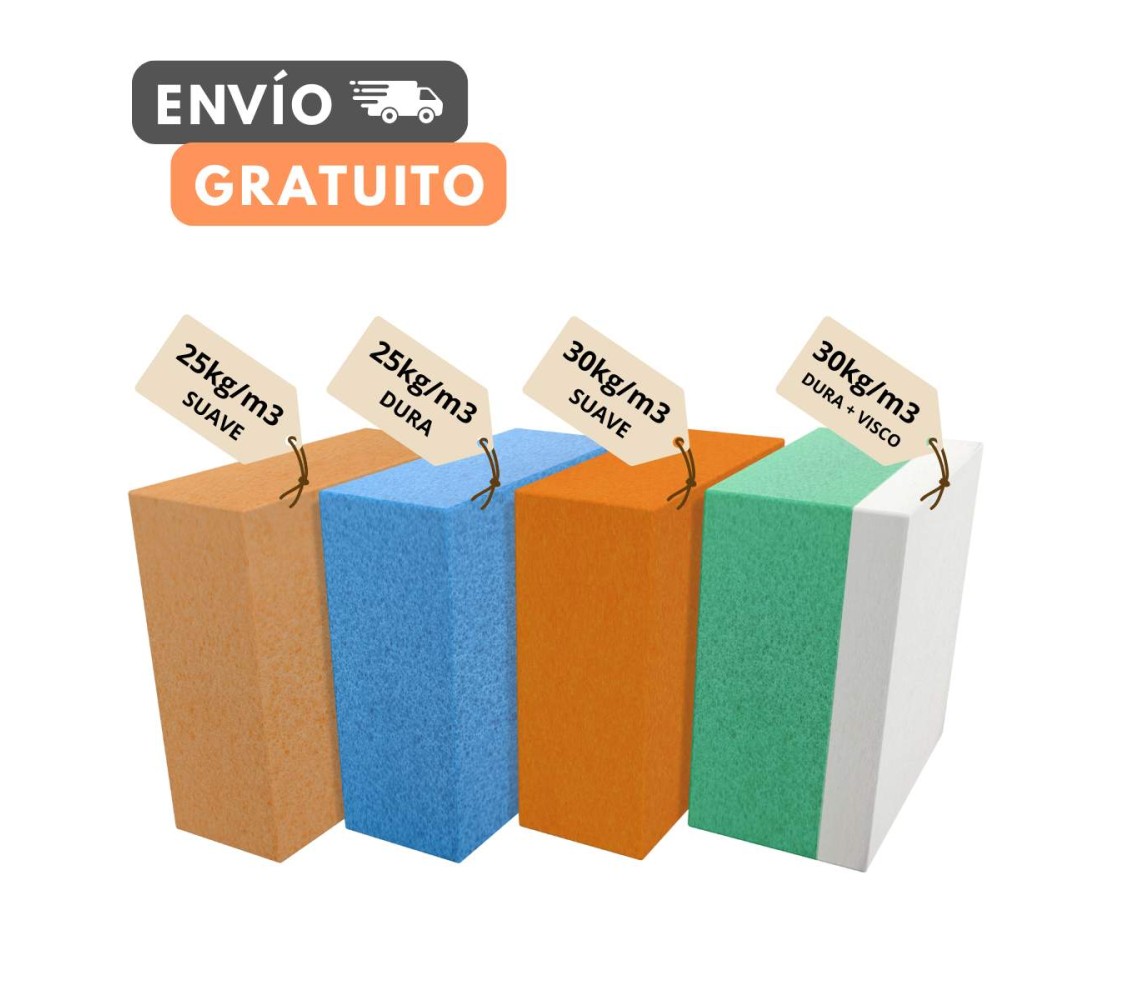 Incluye espumas suaves y duras en densidades 25 y 30 kg/m³, lo que permite cubrir prácticamente cualquier proyecto de uso diario: desde asientos y respaldos hasta sofás, palets, colchonetas y pequeños arreglos en el hogar.